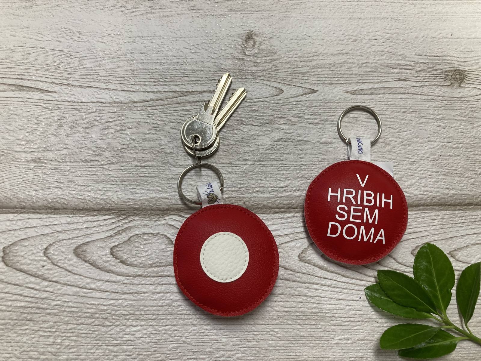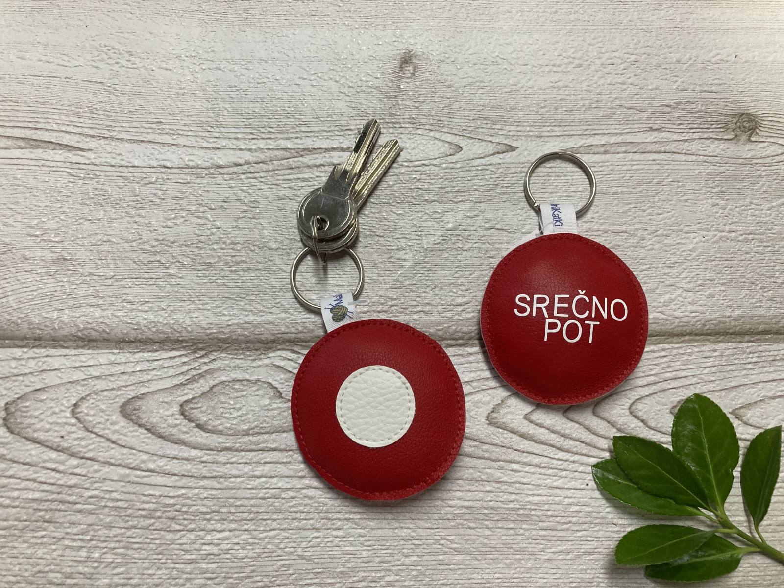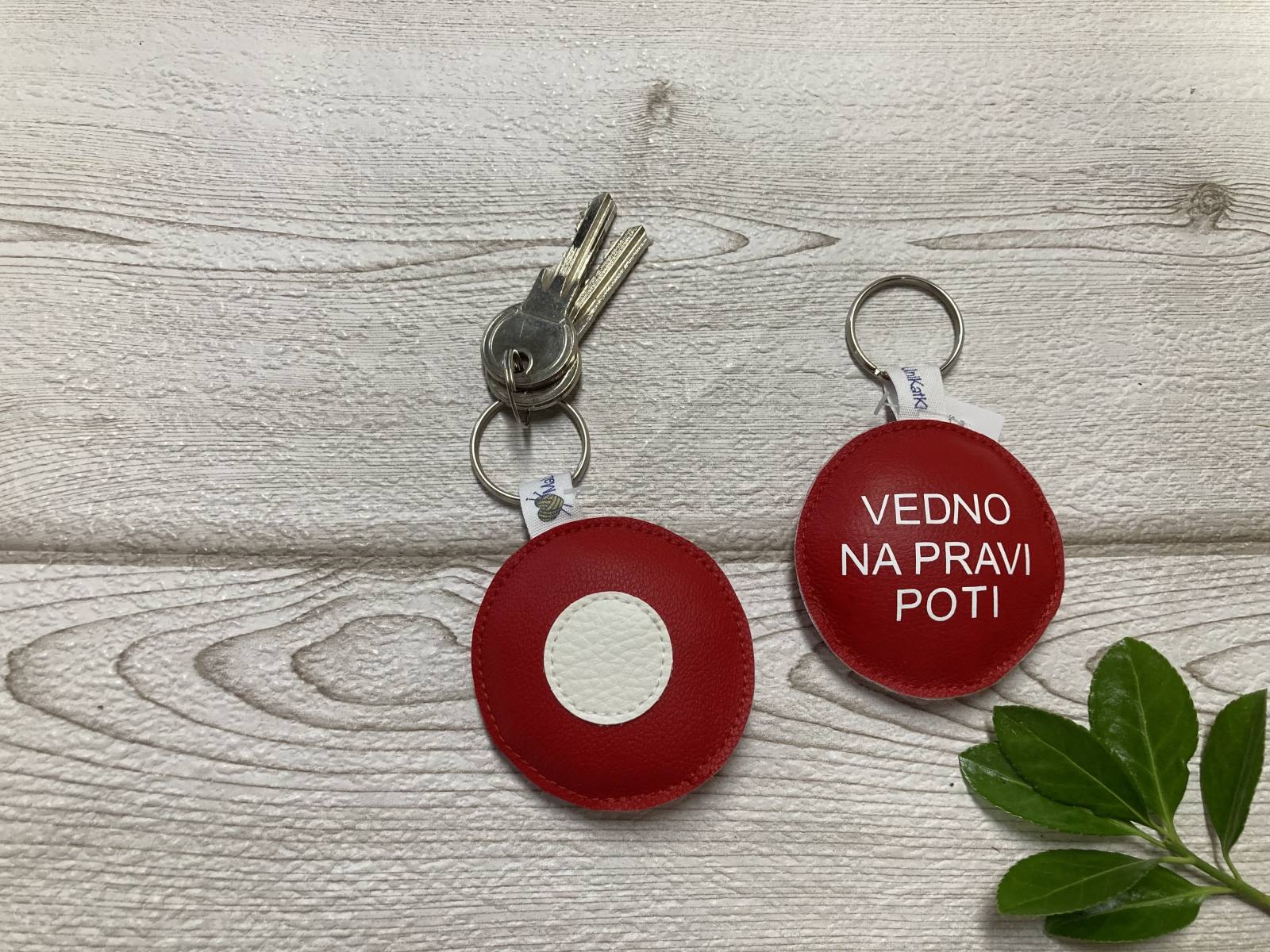 Obesek je narejen iz umetnega usnja, velikosti cca. 6,5 cm.