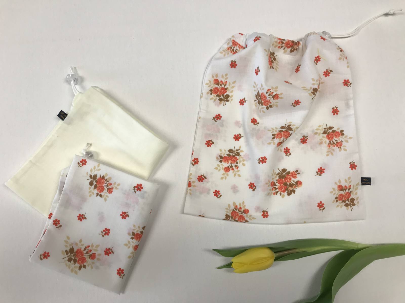 Vrečka je v velikosti 30x35cm 1 kom in 25x30cm 2 kom. Na vrhu se zapira z vrvico na poteg. Komplet vsebuje 3 vrečke, kot so na sliki. Priporočamo za shranjevanje copat, za v trgovino, za sadje in zelenjavo, za darilo ali drugi namen. Vrečke so za večkratno uporabo saj se lahko perejo. Ročno šivano in narejeno v Sloveniji.